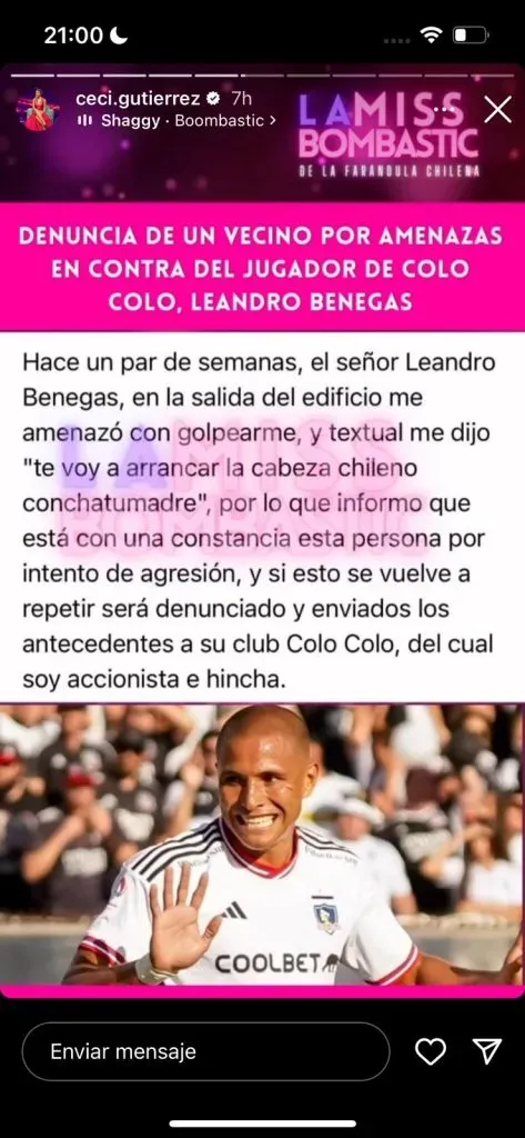 Leandro BenegasLa periodista Cecilia Gutiérrez a través de una historia de Instagram desató la polémica.esperando que tomen acciones con el futbolista después de esta violenta amenaza. Es más, el vecino es accionista de Colo Colo.